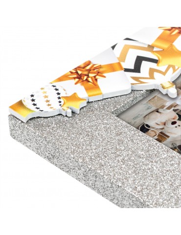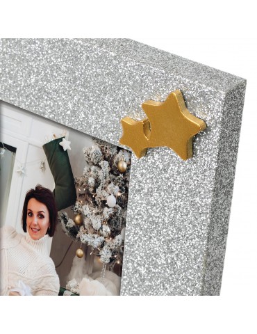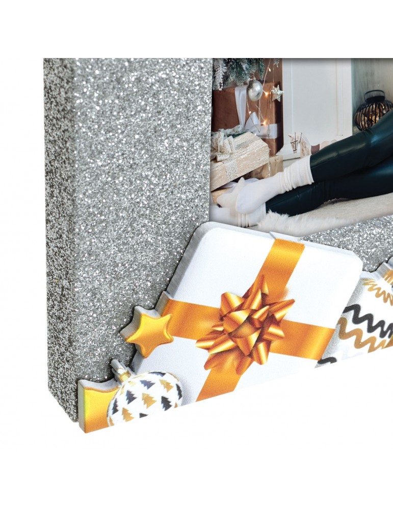 Cornice Silvy in legno, colore argento, con effetto glitterato, con decoro colorato a rilievo, a tema natalizio, da tavolo, idea regalo originale, decorazione natalizia, regalo personalizzato.CARATTERISTICHECATEGORIACornice in legnoMISURA FOTO (cm)10x15COLOREArgento glitter/Bianco/OroSPESSORE CORNICE (cm)1,2MISURA ESTERNA (cm)20x15MISURA ESTERNA (cm) CON SCATOLA16x21x2PESO con scatola (gr)280ORIENTAMENTO IMMAGINEOrizzontaleUTILIZZO (DA TAVOLO/PARETE)Da tavoloRETROMdfPARTICOLARITcornice Glitter argento con decoro traforato e a rilievo, a tema natalizioPACKAGINGScatola