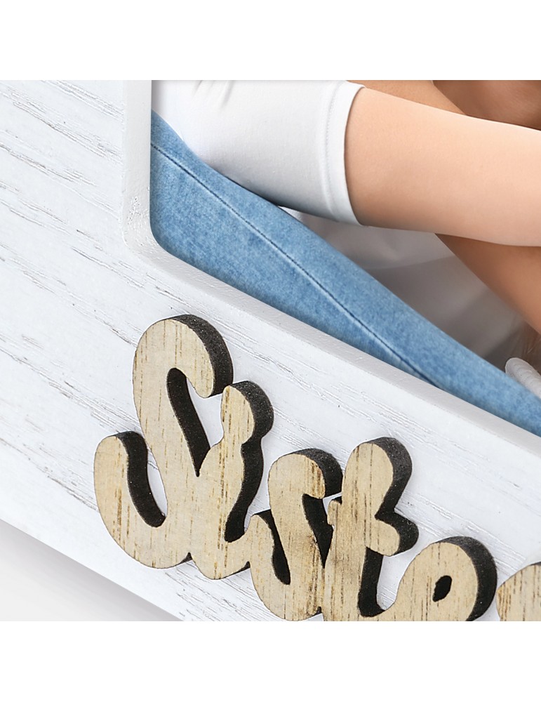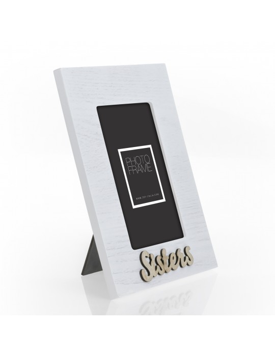 Cornice Lilly in legno, colore bianco, con scritta SISTERS a rilievo, da tavolo, ideale per celebrare anniversari o compleanni, adatta per casa e ufficio, idea regalo originaleCARATTERISTICHECATEGORIACornice in legnoMISURA FOTO (cm)10x15COLOREBianco/ Legno naturaleSPESSORE CORNICE (cm)0,9MISURA ESTERNA (cm)17x22MISURA ESTERNA (cm) CON SCATOLA18,5x23x2,2PESO con scatola (gr)315ORIENTAMENTO IMMAGINEVerticaleUTILIZZO (DA TAVOLO/PARETE)Da TavoloRETROMdfPARTICOLARITprofilo classico con decoro a rilievoPACKAGINGScatola