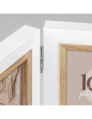Cornice Ayas 3Q in legno, colore bianco e marrone, multifoto da tavolo, per 3 foto, profilo classico, adatta per casa e ufficio, idea regalo originale.CARATTERISTICHECATEGORIACornice in legnoMISURA FOTO (cm)3x10x15COLOREBianco/ legno chiaroSPESSORE CORNICE (cm)1,5MISURA ESTERNA (cm)38x17,5LARGHEZZA ASTA (cm)1,8MISURA ESTERNA (cm) CON SCATOLA570ORIENTAMENTO IMMAGINEVerticaleUTILIZZO (DA TAVOLO/PARETE)Da tavoloRETROMdfPARTICOLARITCornice multiplaPACKAGINGScatola