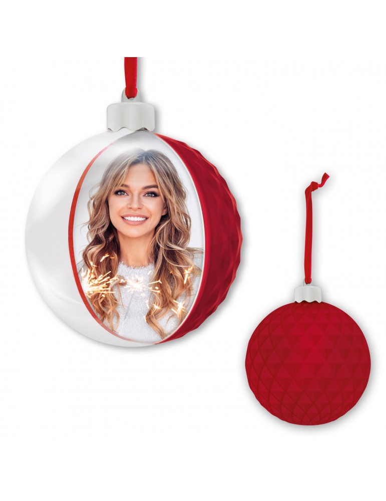 Photo Christmas Diamond Red, palla di natale con foto, in plastica meta di colore rosso con decoro a rilievo e meta trasparente, personalizzabile con foto, da appendere, idea regalo originale, addobbo o decorazione natalizia, regalo personalizzato.CARATTERISTICHECATEGORIAPalla di Natale con fotoMISURA FOTO (cm)10x10COLORETrasparente/RossoMISURA ESTERNA (cm) 10 h10LARGHEZZA ASTA (cm)10,2x10,2x10,2MISURA ESTERNA (cm) CON SCATOLA105ORIENTAMENTO IMMAGINECerchioUTILIZZO (DA TAVOLO/PARETE)Da appenderePARTICOLARITPalla di natale con decoro a rilievo nel retroPACKAGINGScatola