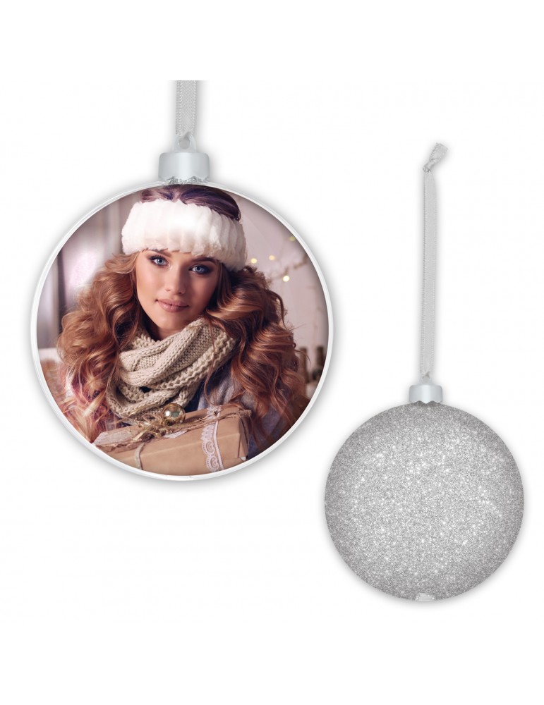 Photo Christmas Silver, palla di natale effetto piatto con foto, in plastica meta di colore argento con decoro a rilievo e meta trasparente, nuovo sistema glitter stop per evitare che i brillantini si disperdano, personalizzabile con foto, da appendere, idea regalo originale, addobbo o decorazione natalizia, regalo personalizzato.CARATTERISTICHECATEGORIAPalla di Natale con fotoMISURA FOTO (cm)8,5x8,5COLORETrasparente/ArgentoMISURA ESTERNA (cm) 7,5 h8,7LARGHEZZA ASTA (cm)5x5,2x9MISURA ESTERNA (cm) CON SCATOLA65ORIENTAMENTO IMMAGINECerchioUTILIZZO (DA TAVOLO/PARETE)Da appenderePARTICOLARITPalla di natale con nuovo sistema glietter stop nel retroPACKAGINGScatola