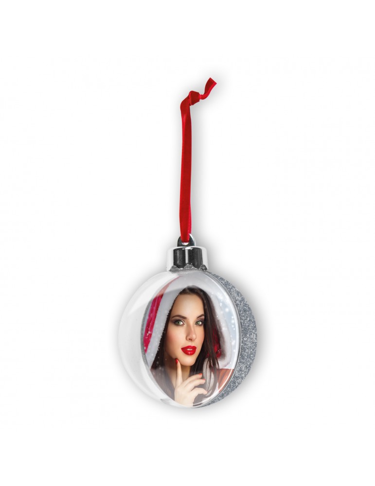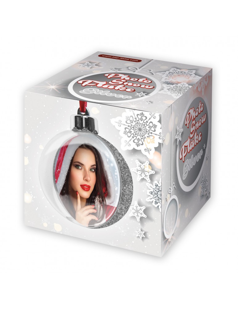 Photo Snow Flake Silver, palla di natale con foto, in plastica meta di colore argento con decoro glitter e meta trasparente, personalizzabile con foto, da appendere, display espositivo da 6 pezzi, idea regalo originale, addobbo o decorazione natalizia, regalo personalizzato.CARATTERISTICHECATEGORIAPalla di natale con fotoMISURA FOTO (cm)7,5 x 7,5COLORESilver / trasparenteMISURA ESTERNA (cm)8,7 x 8,7 x 8,7 (scatola singola)MISURA ESTERNA (cm) CON SCATOLA18 x 26,5 x 9,5 (kit 6 pz)PESO con scatola (gr)535 (kit 6 pz)ORIENTAMENTO IMMAGINECerchioUTILIZZO (DA TAVOLO/PARETE)Da appenderePARTICOLARITPalla di natale meta di colore argento con decoro glitter e meta trasparente, personalizzabile con 1 foto .Display espositivo da 6 pezziPACKAGINGScatola stampata